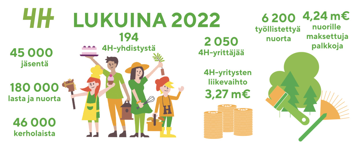 4H:n kautta työllistyi 6 200 nuorta vuonna 2022 ja heille maksettiin yli 4,24 miljoonaa euroa palkkatuloa. Näistä nuorista lähes 4 900 oli 13–17-vuotiaita eli 4H tarjoaa monelle nuorelle heidän ensimmäisen, tärkeän työkokemuksensa.