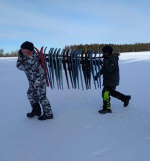 Lumikenkäily alkoi jo väsyttää, pojat keksivät oivan konstin. Lopuksi herkuteltiin, kiitos retkestä!