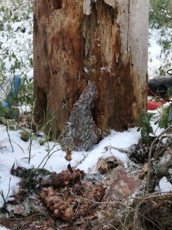 Tikka koputellu koloja nikallaan puun runkoon, eysiny ötököitä, joiden koloja löytyi myös. Tikka oli syöny myös käpyjen suomujen alta siemeniä.
