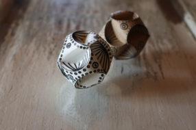 Materiaalit taipuisaa pakkauspahvia, esim. tuorekelmupaketti sakset sukkapuikko tai muu terävähkö piikki kirkasta teippiä musta ohut tussi (jos pahvin pinta on liukas, pitää tussin olla vedenkestävä) kaksi limsapullon kierrekorkkia riisiä, raesokeria tai soraa Ohje Kopioi ohessa oleva kaava toiselle paperille ja leikkaa kaava irti ääriviivoja pitkin. Aseta kaava pahvin päälle ja piirrä ääriviivat. Toista, kunnes …