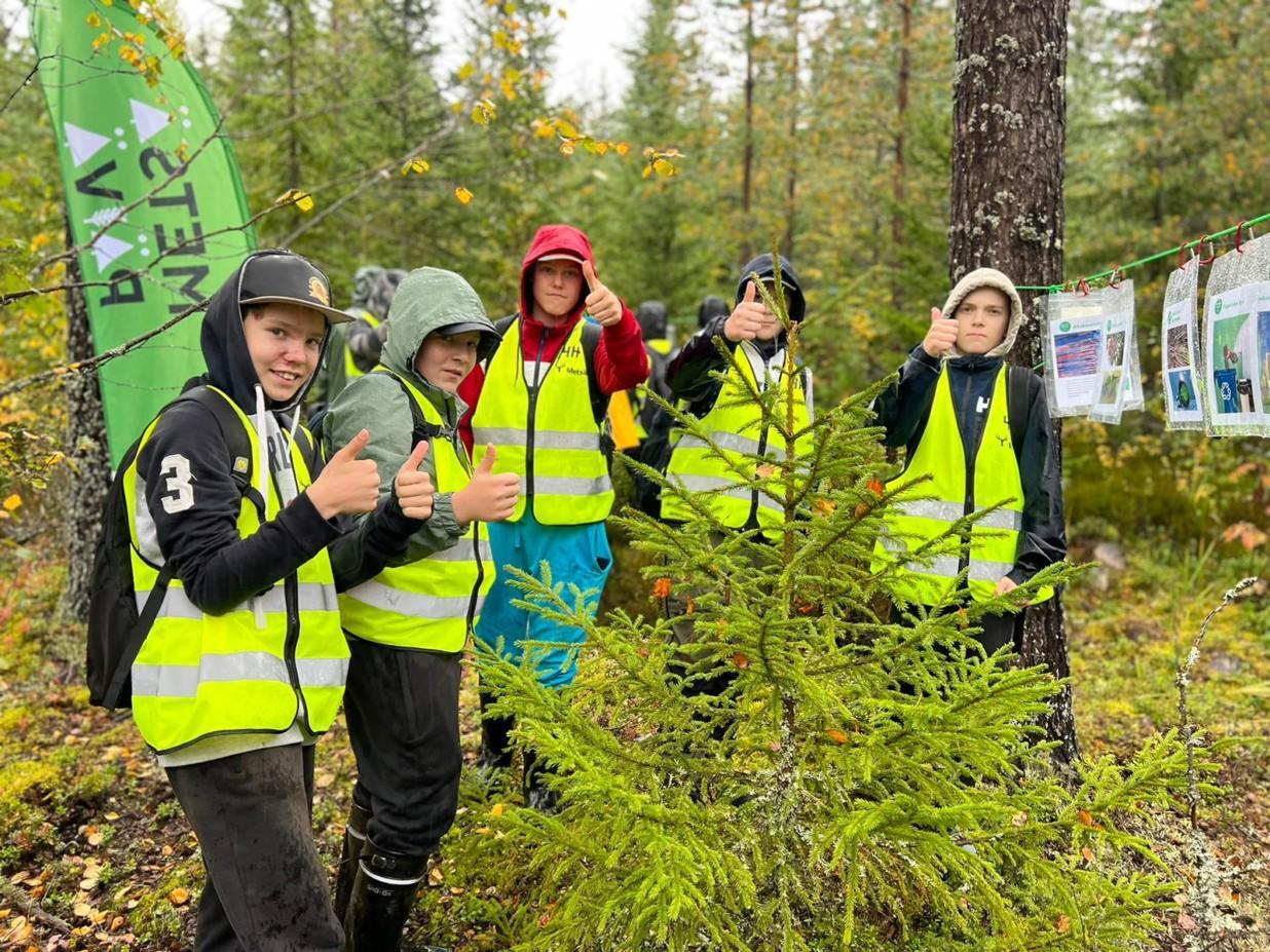 Koulujen metsäpäivissä tavoitetaan vuosittain noin 35 000 ala- ja yläkoululaista. 4H:n ja Metsä Groupin yhdessä toteuttamat metsäpäivät ovat osa tätä kokonaisuutta. Kuvissa seikkailevat Kihniön yläkoululaiset retkeilivät syyskuun lopussa Virtain kohteella tutustumassa käytännönläheisesti metsään. Sateinen syyskeli ei ainakaan koko aikaa haitannut nuorten hymyä ja tekemistä.