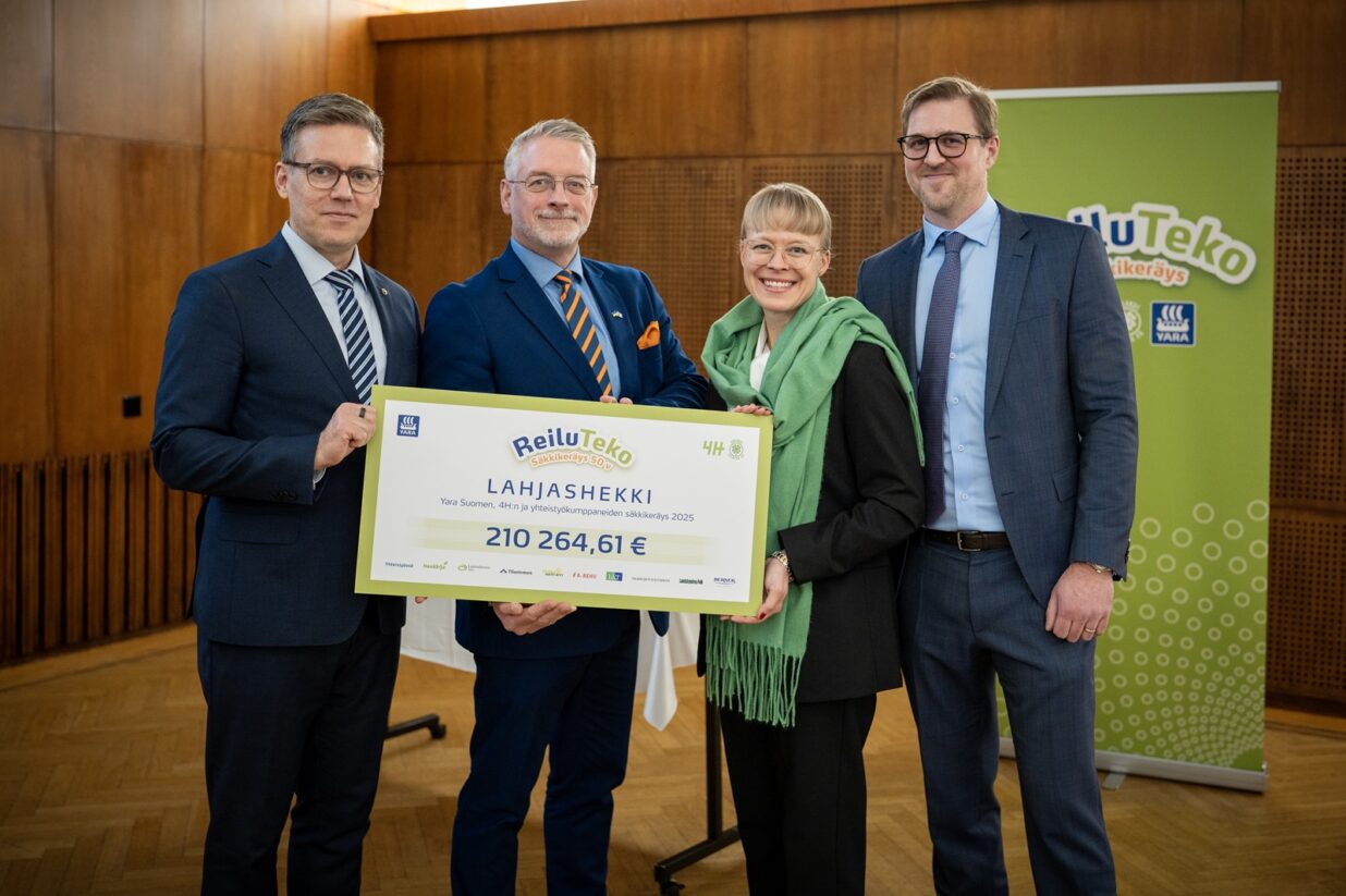 Yara Suomi luovutti Reilu Teko -säkkikeräyksen tuoton 4H-järjestöille juhlalounaalla Helsingissä 26.11. Shekin ottivat vastaan 4H-liiton puheenjohtaja, kansanedustaja Marko Kilpi, toimitusjohtaja Tomi Alakoski sekä Finlands svenska 4H:n kehitysjohtaja Bettina Lindfors.
