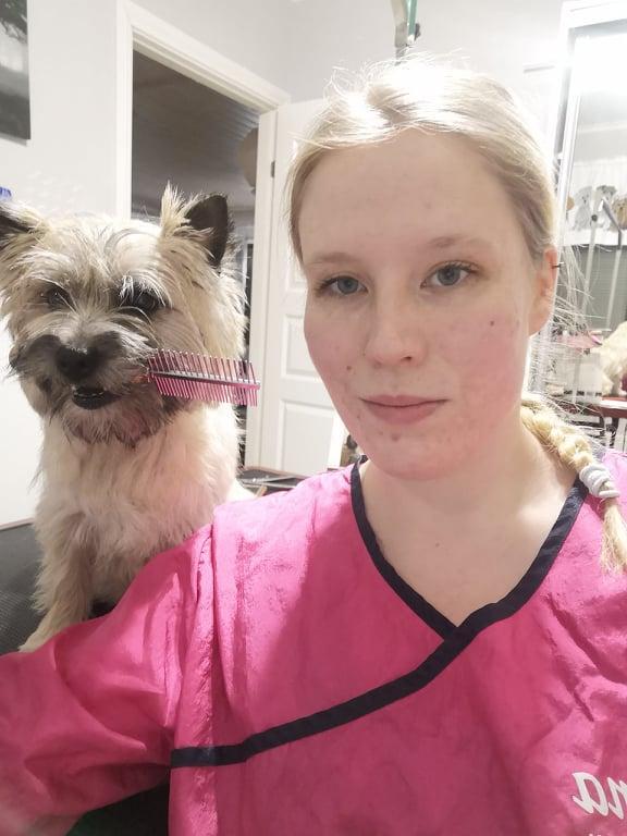 ”Koiraharrastuksesta tuli työ minulle. Yritykseni tarjoaa trimmauspalveluja edulliseen opiskelijahintaan monille eri koiraroduille. Lähdin vuonna 2019 opiskelemaan Eläintenhoidon ammattitutkintoa Trimmaamisen osaamisen alaa. Korona sulki koulujen ovet ja oli pakko oppia kotoa käsin. Päätin etsiä harjoituskoiria somesta ja kysyntä räjähti. Trimmaajia kun ei täällä pohjoisessa juurikaan ole niin töitä oli paljon.