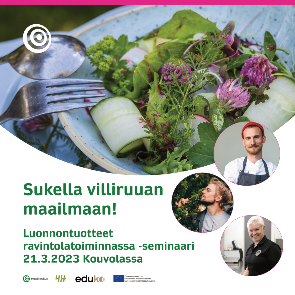 Tervetuloa kuulemaan ravintorikkaiden luonnontuotteiden käytöstä ja niiden monista mahdollisuuksista Luonnontuotteet ravintolatoiminnassa -seminaariin 21.3.2023 klo 9.00-12.00. Seminaarissa luonnontuotealan ammattilaiset kertovat keruutuotteiden matkasta luonnosta lautaselle, lasiin ja tuotteiksi.